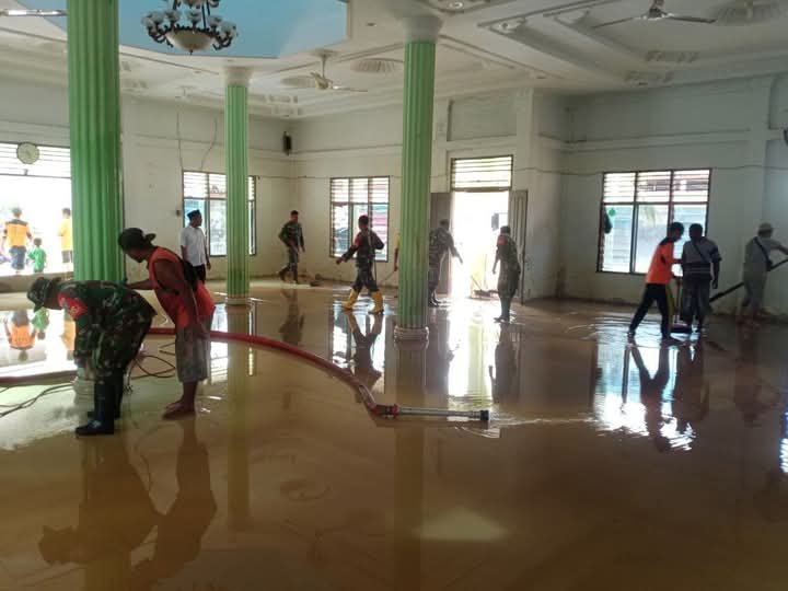 Aceh Tenggara, Jejak-Kriminal.Com, Babinsa Koramil 02/Bambel, Serda Baginda Sinaga dan Kopda Nasir jajaran Kodim 0108/Agara melaksanakan kegiatan gotong royong bersama masyarakat membersihkan rumah dan tempat ibadah, Pasca banjir yang melanda Desa menyebabkan genangan air di sertai lumpur masuk ke dalam masjid dan pekaranganya, Didesa rikit kecamatan Bambel, Kabupaten Aceh Tenggara. Sabtu (23/11/2024).