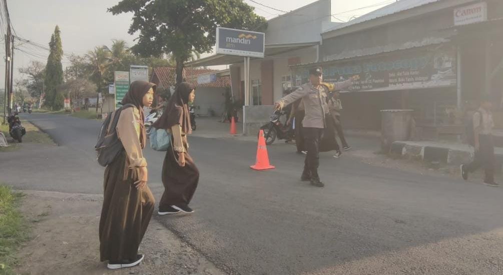 *Bantu Anak Menyebrang, Polsek Lakbok Polres Ciamis Pelayanan Masyarakat di Depan Sekolah*
