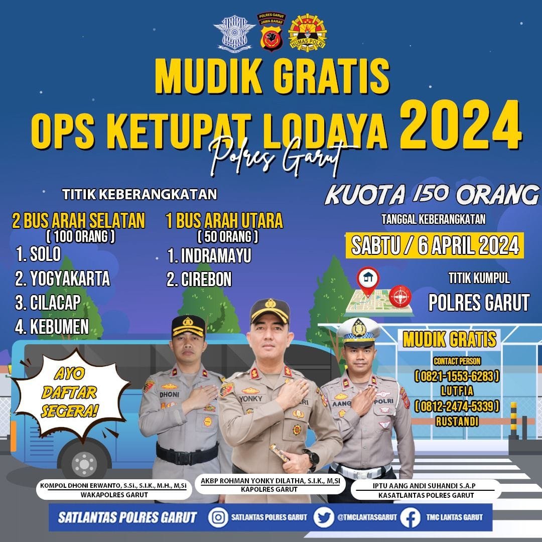 Salah satunya yakni kegiatan program Mudik Gratis Ops Ketupat Lodaya 2024 Polres Garut, Kapolres Garut AKBP Rohman Yonky Dilatha, S.I.K. M.Si., mengatakan jika kegiatan mudik gratis ini diselenggarakan untuk membantu masyarakat yang hendak pulang ke kampung halamannya namun terkendala oleh biaya, sarana ataupun kendala lainnya. Senin pagi (25/03/2024).