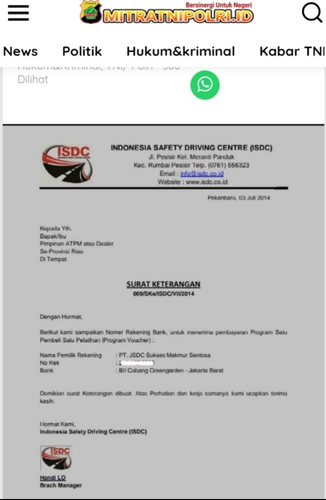 Belakangan ini viral media online mitra tni-polri.id yang berjudul Di Duga Data Klaim Voucher Pendidikan Keselamatan Berlalu Lintas Tidak Ada, Kekantong Siapa Aliran Dana Voucher Ratusan Juta Perharinya ?? Jajaran Dirlantas Polda Riau Atau ISDC