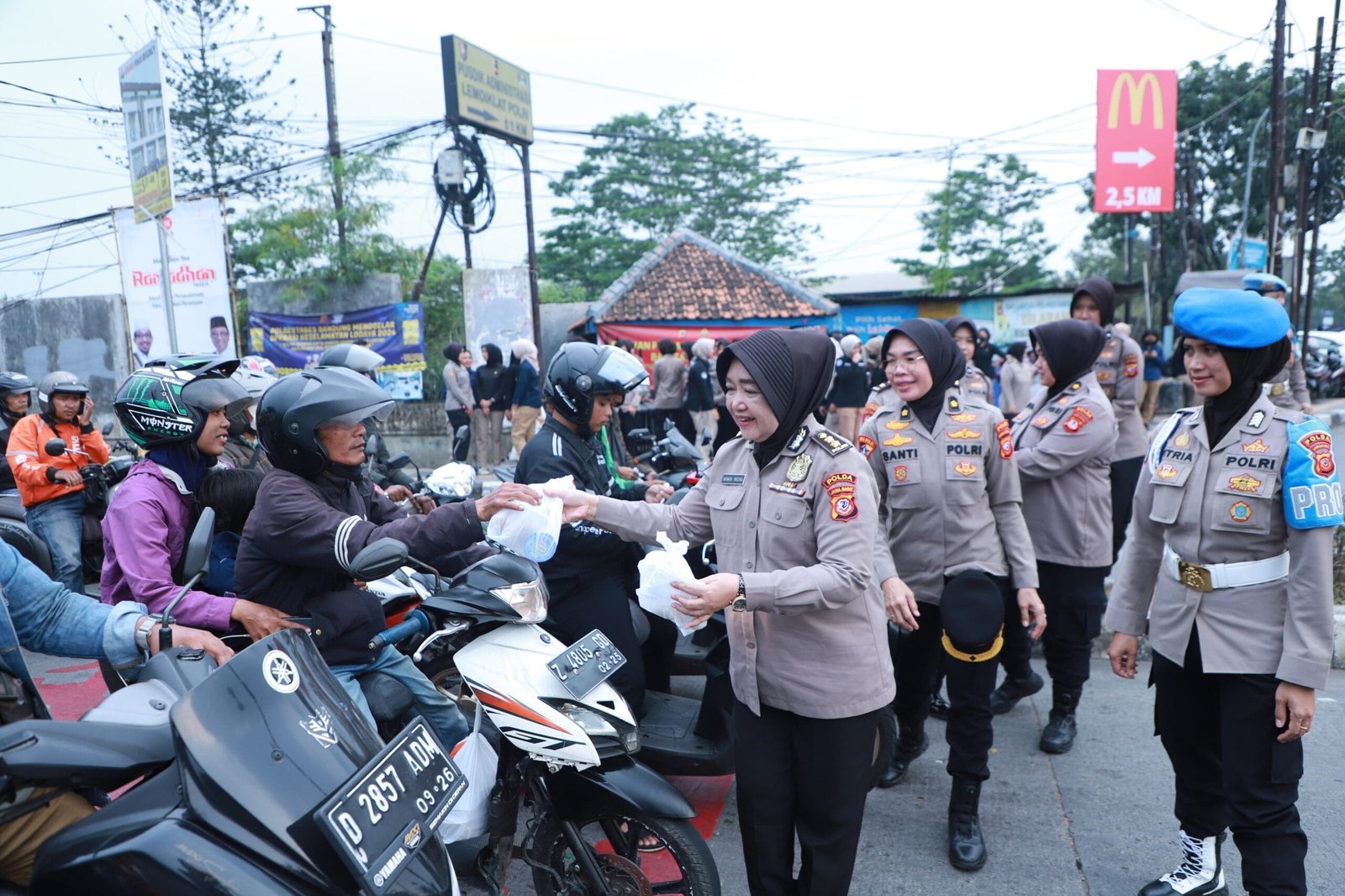 Raih Berkah Ramadhan, Polwan Polda Jabar Bagi Bagi Takjil Gratis Kepada Masyarakat Pengguna Jalan