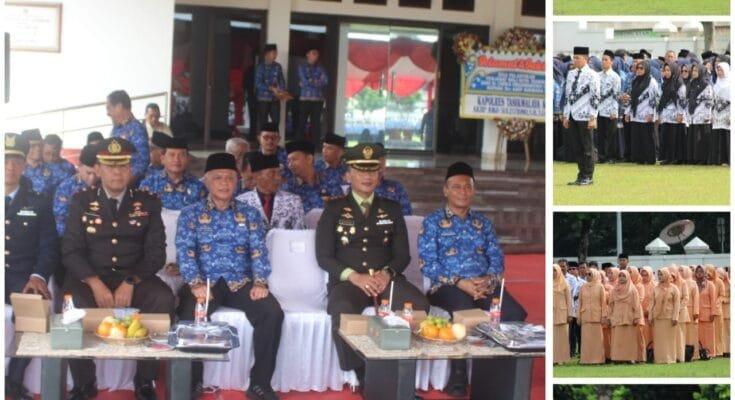 Upacara dipimpin langsung oleh Penjabat Wali Kota Tasikmalaya, Drs. Asep Sukmana, M.Si., yang bertindak sebagai inspektur upacara (irup). Dalam sambutannya, beliau menekankan pentingnya kolaborasi dan semangat pengabdian dari seluruh elemen, baik anggota KORPRI, guru yang tergabung dalam PGRI, maupun para anggota Dharma Wanita, dalam mendukung pembangunan Kota Tasikmalaya.