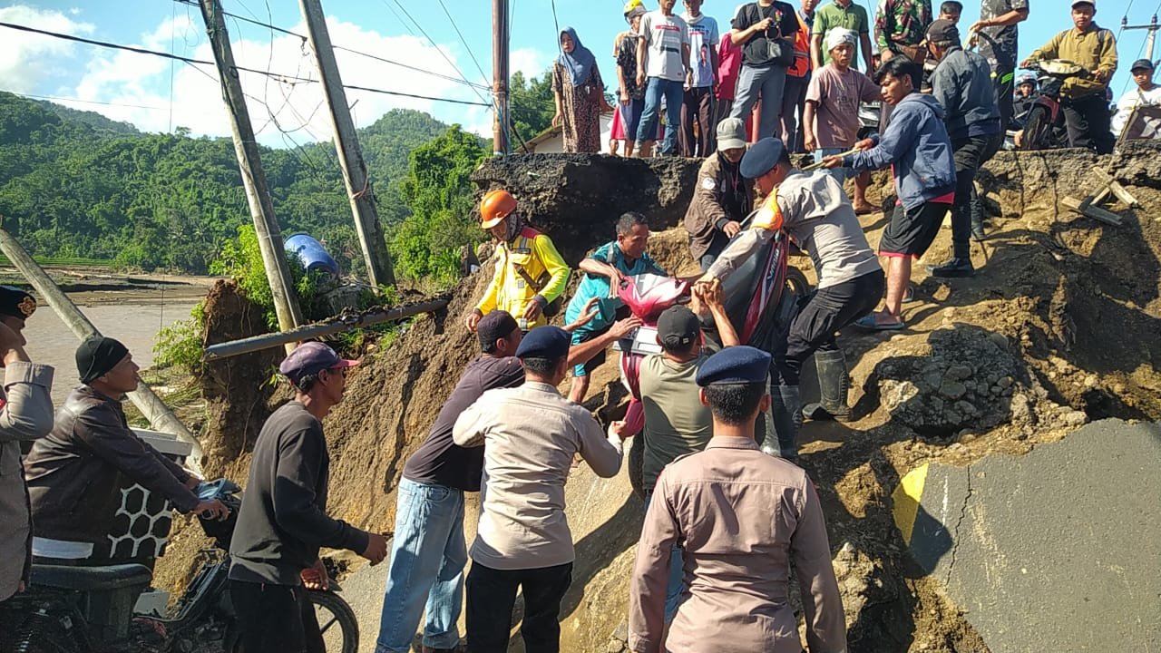 Tim Brimob Polda Jabar sigap mengerahkan personel untuk membantu warga, terutama pejalan kaki dan pengendara sepeda motor yang harus menyeberang di titik jembatan yang terputus. Dengan strategi pengamanan yang matang, anggota Brimob berjibaku di medan sulit demi keselamatan masyarakat.