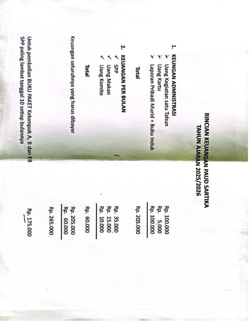 Sumenep , Sabtu 2 Agustus 2025 -Di tengah semangat para orang tua dan siswa usia dini yang antusias menyambut tahun ajaran baru, dugaan praktik pungutan liar (pungli) justru mencoreng proses Penerimaan Peserta Didik Baru (PPDB) di salah satu lembaga pendidikan anak usia dini, yakni TK SARTIKA yang Beralamat jl.Cipto No 38 Kota Sumenep.