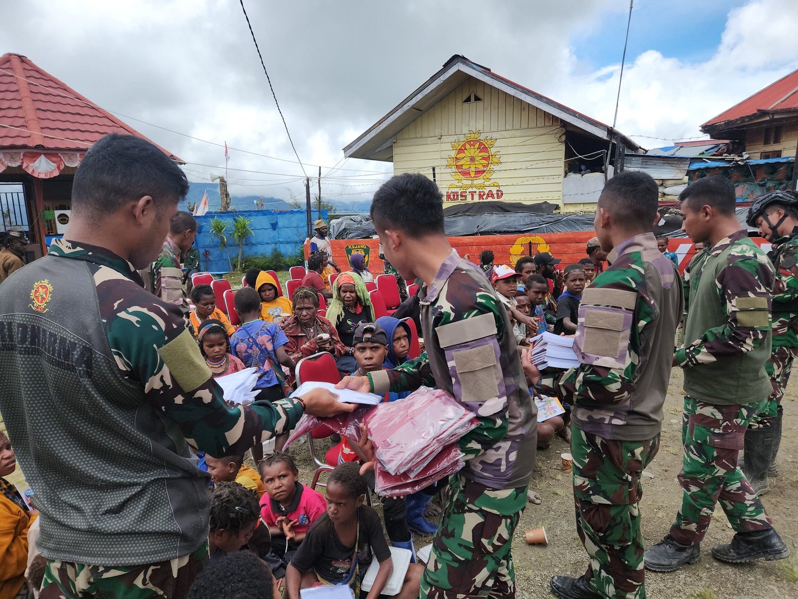 Intan Jaya – Di penghujung masa pengabdiannya di daerah penugasan, tak sedikitpun menyurutkan niat dan semangat Satgas Pamtas Mobile Yonif 330 Kostrad untuk terus melakukan aksi nyata dan hal positif yang manfaatnya dirasakan secara langsung oleh masyarakat di daerah penugasan. Seperti yang dilakukan pada Jumat (8/3/24), tatkala para Ksatria Tri Dharma menggelar program Jumat berkah dengan membagikan 200 buku tulis dan 50 Seragam Sekolah bertempat di Pos Japugau Janambani (J2), Kab. Intan Jaya, Papua Tengah.