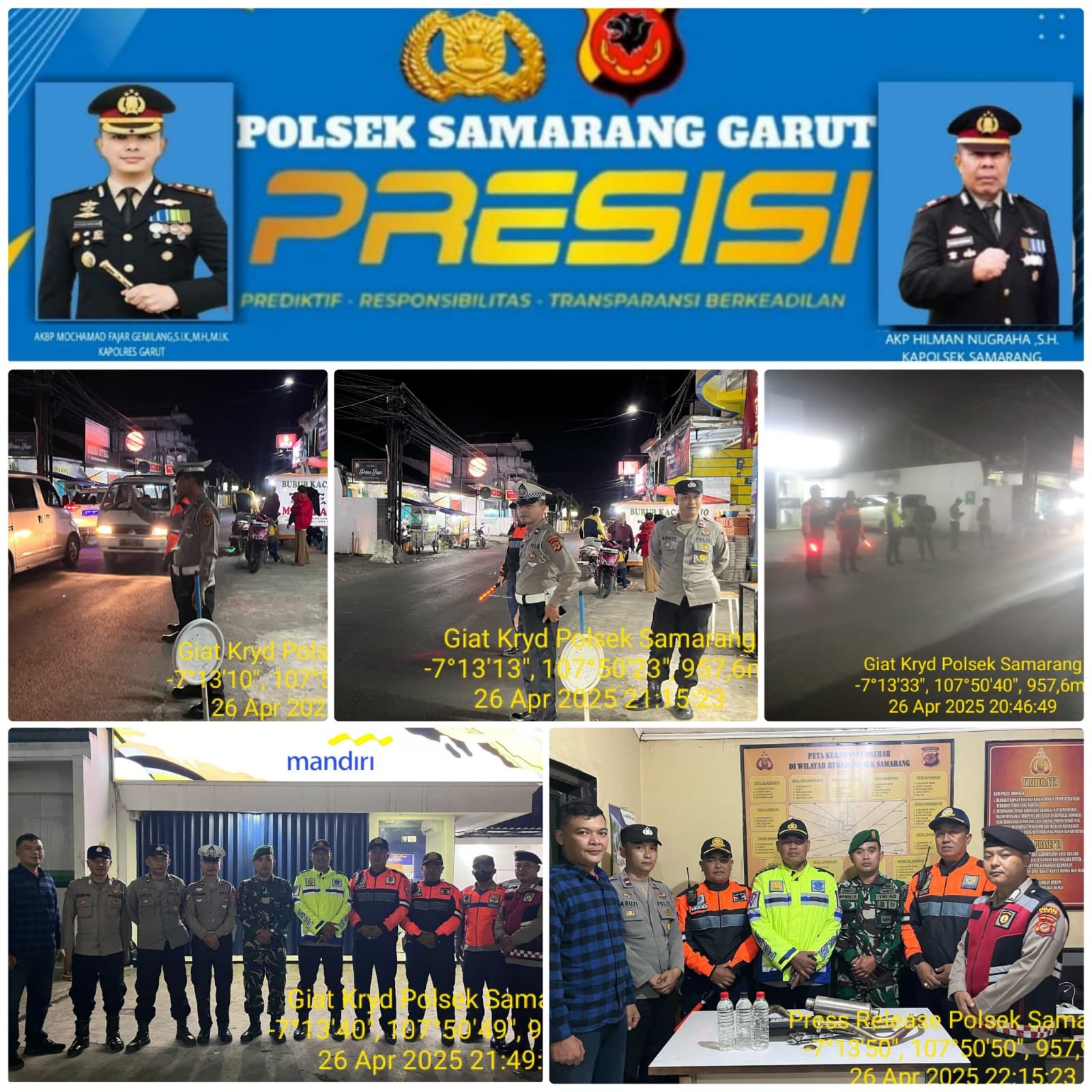 GARUT – Kanit Reskrim Polsek Samarang, IPDA Abdurokhman, S.Pd., bersama anggota melaksanakan kegiatan Kegiatan Rutin Yang Ditingkatkan (KRYD) dalam rangka Cipta Kondisi di wilayah hukum Polsek Samarang. Kegiatan ini dilaksanakan di halaman Bank Mandiri Samarang pada Sabtu malam (26/04/2025).