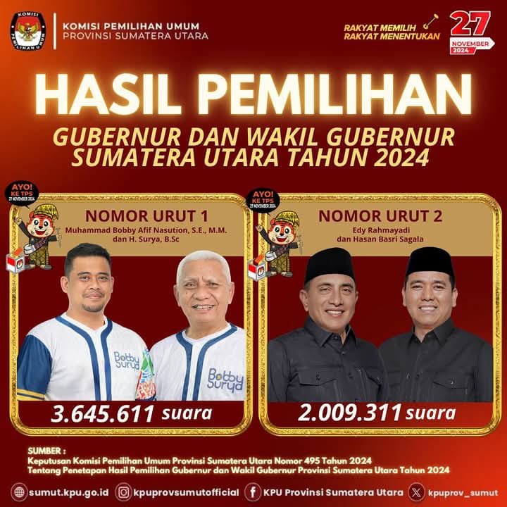 Sumut.Jejak-kriminal.com-Komisi Pemilihan Umum (KPU) telah mengumumkan hasil sementara Pemilihan Gubernur dan Wakil Gubernur Sumatera Utara 2024. Pasangan nomor urut 1, Muhammad Bobby Afif Nasution dan H. Surya*unggul dengan perolehan suara 64,52% (setara dengan 3,43 juta suara). Pasangan ini diusung oleh koalisi besar partai, termasuk Partai Golkar, Gerindra, PAN, NasDem, dan lainnya.