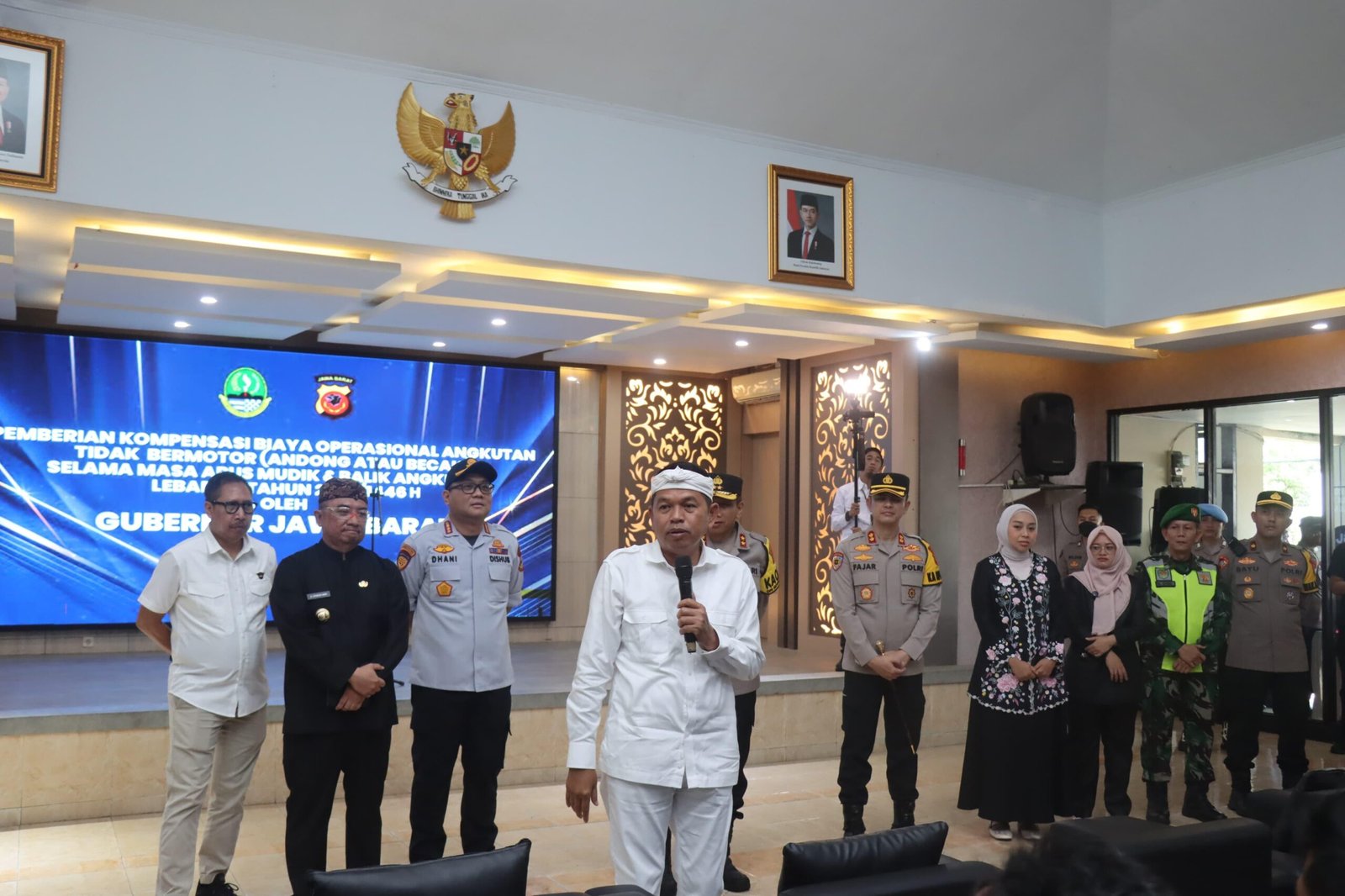 JAWABARAT–Gubernur Jawa Barat, H. Dedi Mulyadi S.H., M.M., bersama Kapolda Jawa Barat, Irjen. Pol. Dr. Akhmad Wiyagus S.I.K., M.Si., M.M., menghadiri acara pemberian kompensasi biaya operasional bagi tukang andong dan becak yang terdampak selama arus mudik dan balik Lebaran 2025/1446 H yang dilaksanakan di Aula Mumun Surachman, Polres Garut.