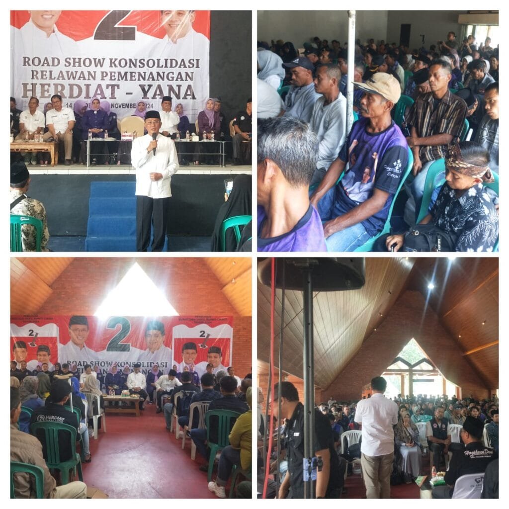 Pasangan Calon Bupati Dr.H.Herdiat Sunarya dan Calon Wakil Bupati Yana D Putra menghadiri Road Show Konsolidasi Relawan Pemenangan Pasangan Herdiat – Yana yang di laksnakan di Aula Gedung Olah Raga Desa Beber Kecamatan Cimargas dan di Gedung Pusat Kebudayaan Karangkamulyan Kecamatan Cijeungjing Kabupaten Ciamis JawaBarat.,Pada Senin 21/10/2024