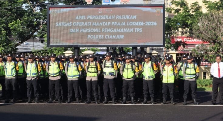 Cianjur – Jejak-kriminal.com- Dalam rangka mengamankan pelaksanaan Pemilihan Kepala Daerah (Pilkada) 2024, Kapolres Cianjur AKBP Rohman Yonky Dilatha, S.I.K., M.Si., M.H. memimpin apel pergeseran pasukan pengamanan tempat pemungutan suara (TPS) Pilkada 2024 di Kabupaten Cianjur, Senin (25/11/2024).