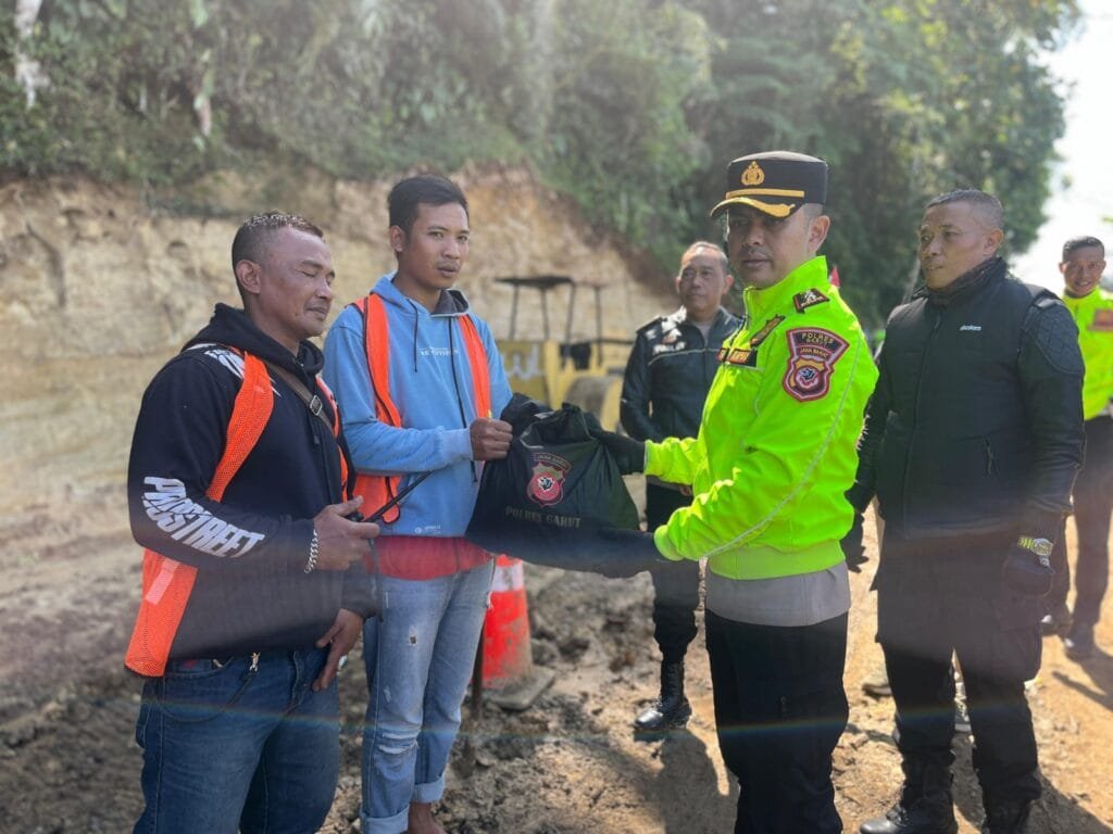 Kapolres Garut turun dan memberikan Bansos kepada 2 orang yang sedang bekerja memperbaiki jalan tersebut.