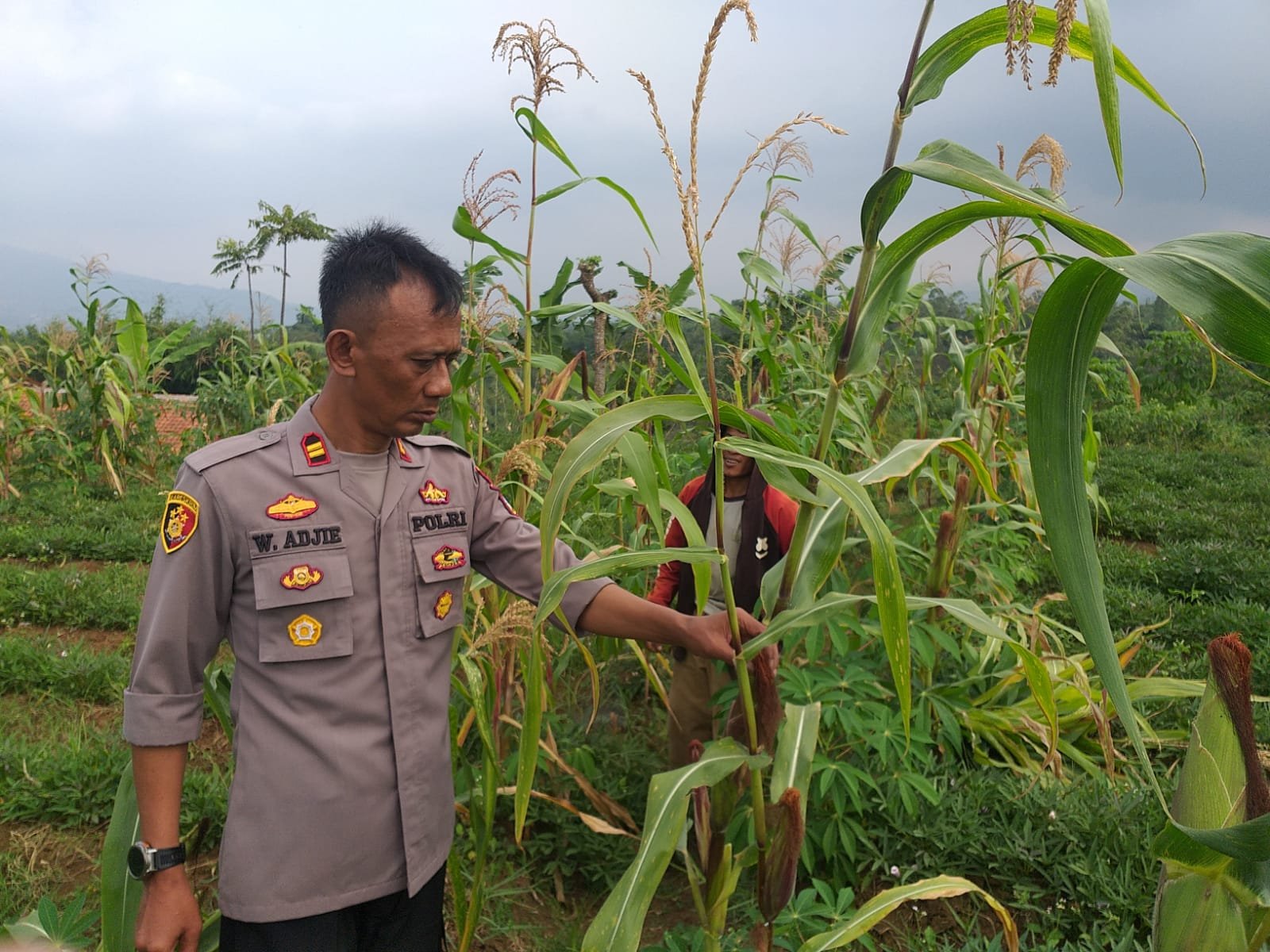Didampingi oleh Bhabinkamtibmas dan perwakilan Gabungan Kelompok Tani (Gapoktan) Bojong Jaya, Kapolsek meninjau lahan jagung seluas 2 hektare yang tengah dikelola oleh kelompok tani setempat.