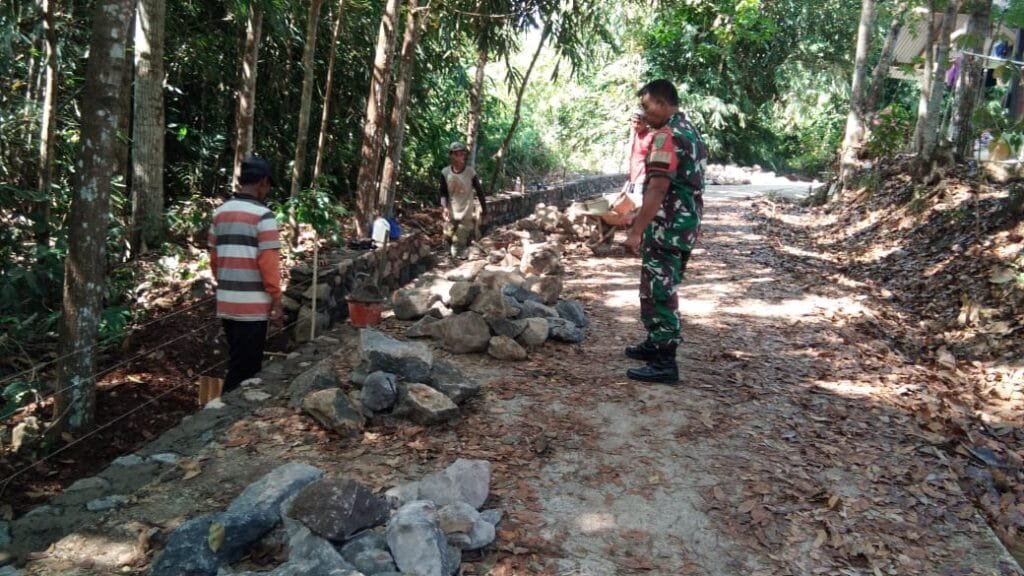 kami disini melaksanakan pembangunan TPT guna mencegah terjadinya longsor yang nantinya akan menutupi selokan, serta pembuatan saluran air sepanjang 251 meter untuk memperlancar saluran air untuk persawahan, sehingga pengaitan bisa optimal”. Jelas Babinsa