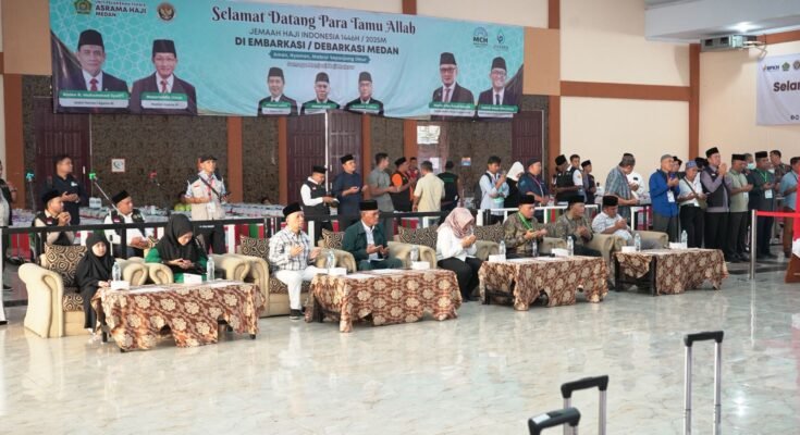 Medan (Humas). Ketua PPIH Debarkasi Medan Ahmad Qosbi dan Wakil Bupati Mandailing Natal Atika Azmi Utammi Nasution menyambut kedatangan jemaah haji Kelompok Terbang (Kloter) 5 di Aula 1 Madinatul Hujjaj Asrama Haji Medan, Selasa (17/6/2025).