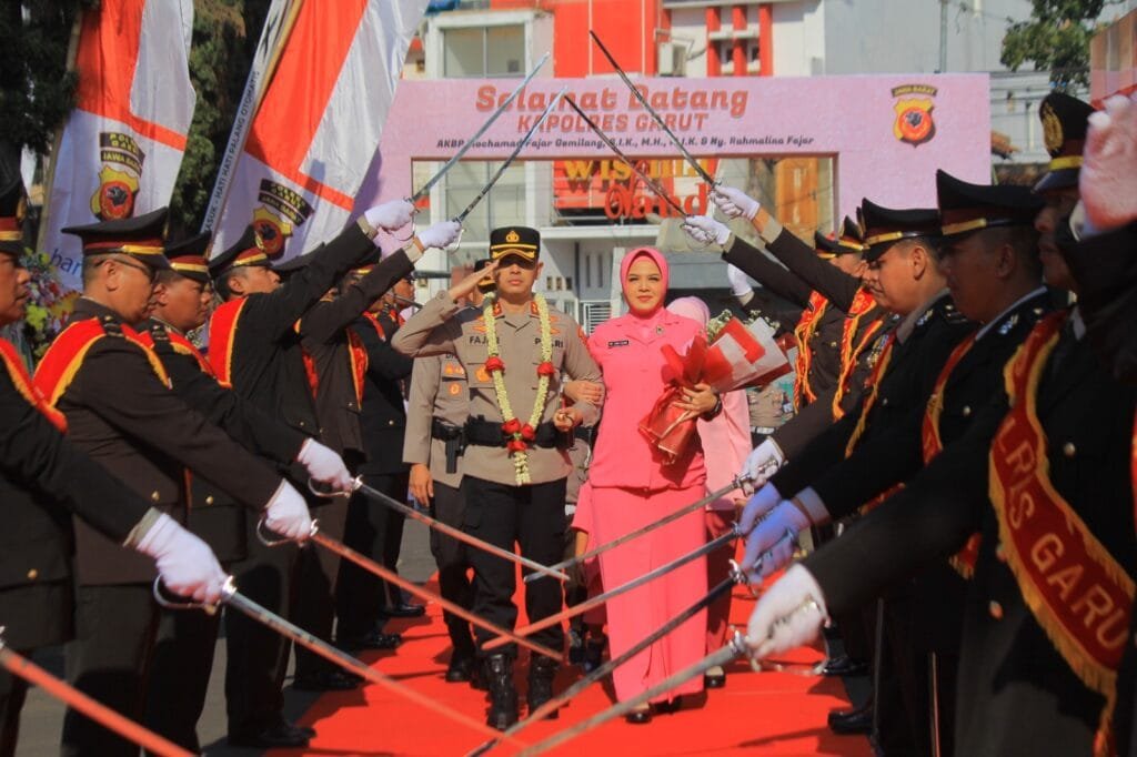 Kapolres Garut AKBP Mochamad Fajar Gemilang, S.I.K., M.H., M.I.K., beserta Ny.Rahmalina Fajar di sambut dengan rangkaian kegiatan jajar hormat , pedang pora , pertunjukan seni budaya sunda dan pengenalan seluruh perwira dan personel Polres Garut.
