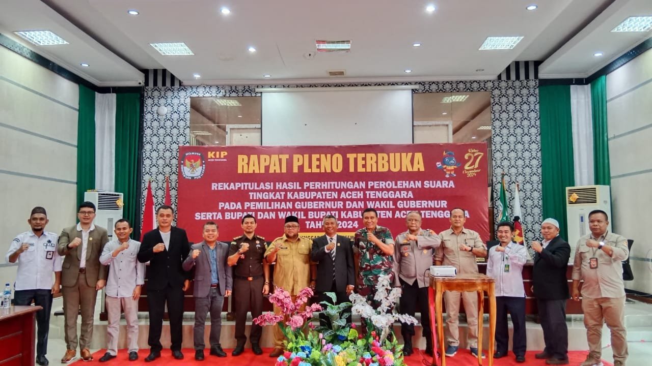 KIP aceh tenggara melaksanakan rapat pleno terbuka tentang rekapitulasi hasil perhitungan suara tingkat kabupaten aceh tenggara pada pemilihan gubernur dan wakil gubernur serta bupati dan wakil bupati kabupaten aceh tenggara tahun 2024, bersama forkopimda dioproom setdakab,