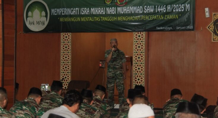 Tasikmalaya, Jumat 31/01/2025 – Dalam rangka memperingati Isra Mi’raj Nabi Muhammad SAW 1446 H/2025 M, Komando Distrik Militer (Kodim) 0612/Tasikmalaya menggelar acara keagamaan yang bertemakan “Membangun Mentalitas Tangguh Menghadapi Percepatan Zaman”. Kegiatan ini berlangsung di Masjid At-Taqwa Makodim 0612/Tasikmalaya dengan dihadiri oleh jajaran prajurit TNI, Persit Kartika Chandra Kirana, tokoh agama, dan masyarakat setempat.