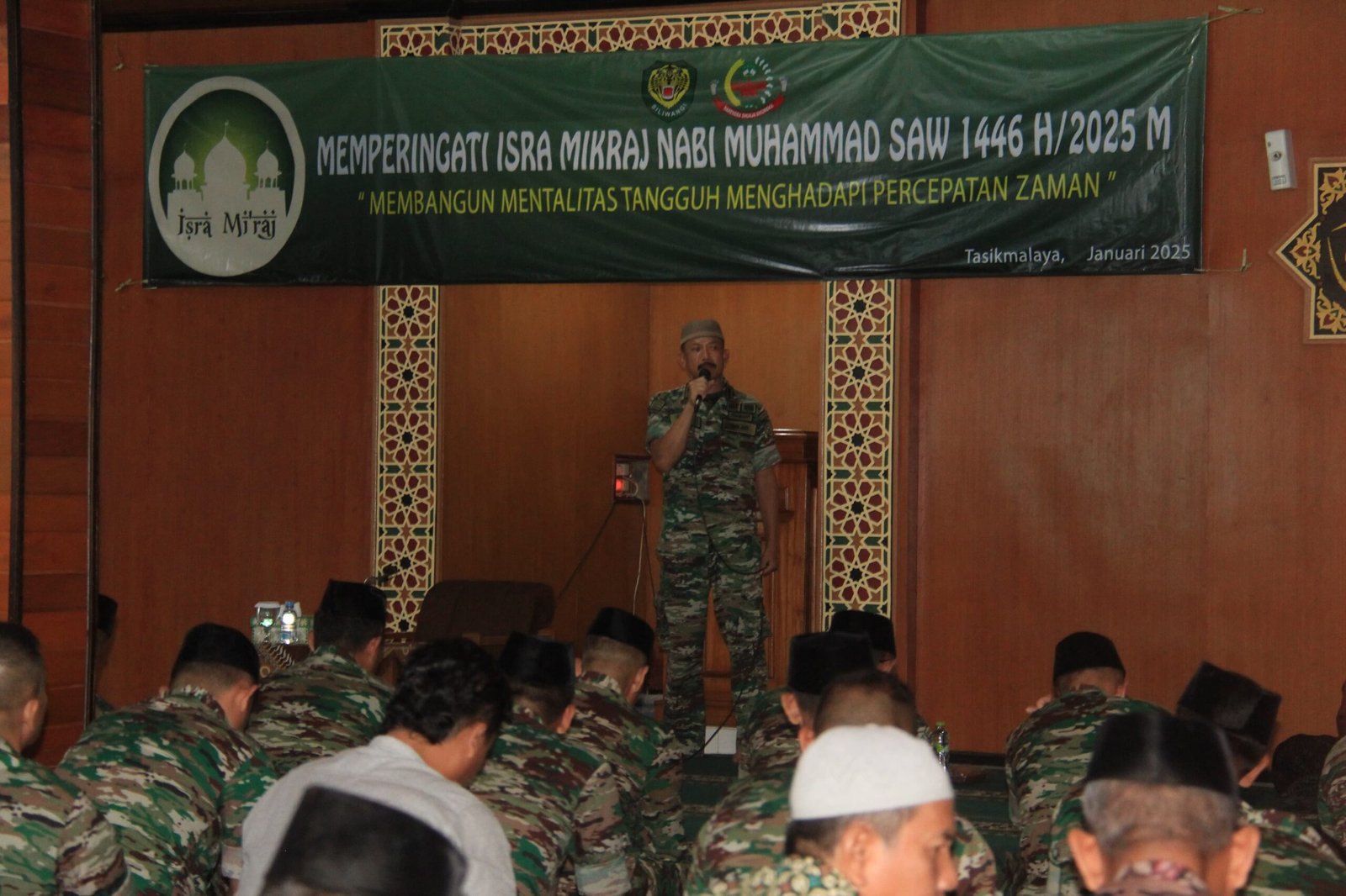 Tasikmalaya, Jumat 31/01/2025 – Dalam rangka memperingati Isra Mi’raj Nabi Muhammad SAW 1446 H/2025 M, Komando Distrik Militer (Kodim) 0612/Tasikmalaya menggelar acara keagamaan yang bertemakan “Membangun Mentalitas Tangguh Menghadapi Percepatan Zaman”. Kegiatan ini berlangsung di Masjid At-Taqwa Makodim 0612/Tasikmalaya dengan dihadiri oleh jajaran prajurit TNI, Persit Kartika Chandra Kirana, tokoh agama, dan masyarakat setempat.