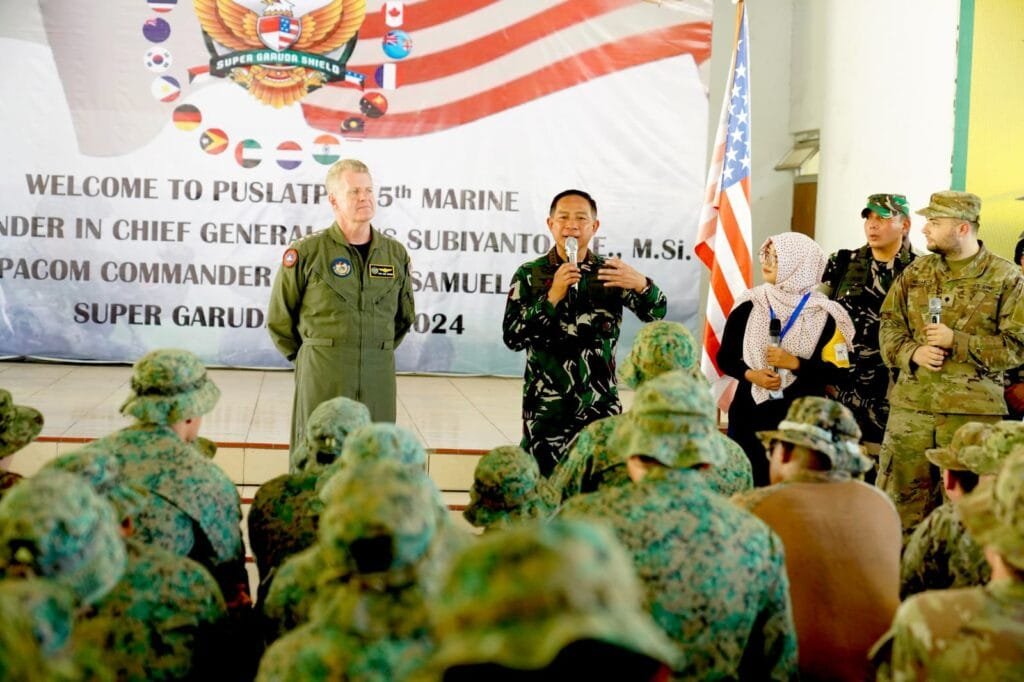 (Puspen TNI). Panglima TNI Jenderal TNI Agus Subiyanto bersama Komandan Komando Asia Pasifik AS Laksamana Samuel J. Paparo melaksanakan tatap muka bersama perwakilan pasukan Multinasional yang tengah berlatih bersama pada latihan Super Garuda Shield 2024, bertempat di Balai Prajurit Puslatpur 5 Marinir, Asembagus Situbondo, Jawa Timur, Sabtu (31/8/2024).