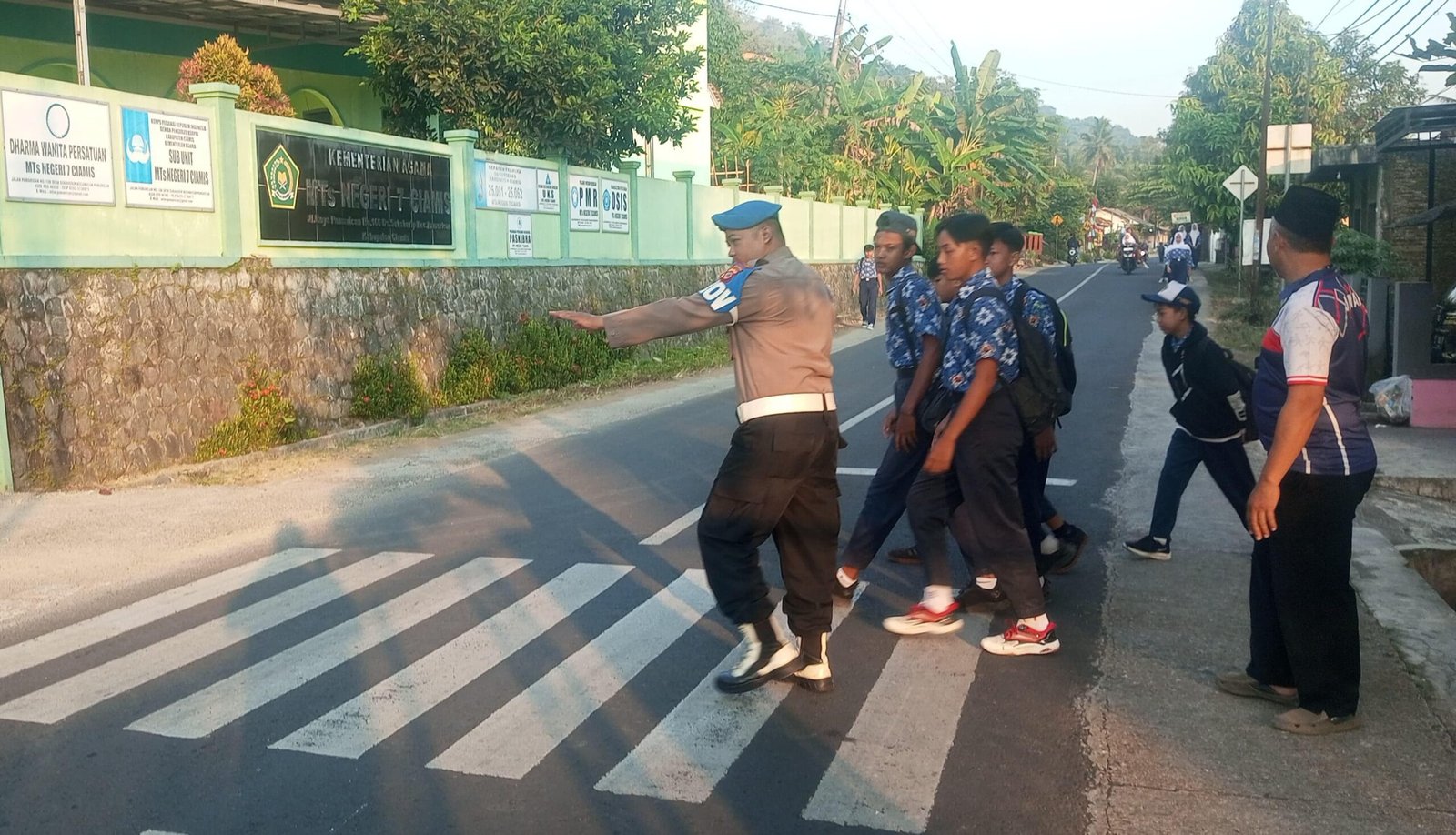 CIAMIS ~ Polsek Pamarican Polres Ciamis Polda Jabar melaksanakan kegiatan pelayanan masyarakat di pagi hari berupa pengaturan arus lalu lintas dengan sasaran anak sekolah. Kegiatan ini dilaksanakan Jalan Raya Padat Aktifitas Warga dikawasan MTs Negeri 1 Pamarican, Kecamatan Pamarican, Kabupaten Ciamis, Jawa Barat, Rabu (23/7/2025).