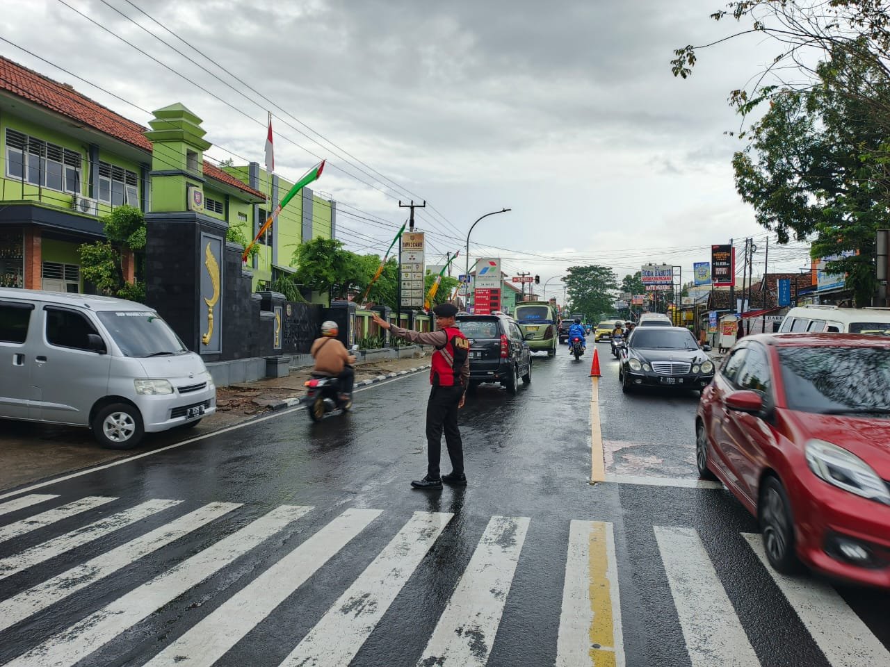 Personel melakukan pelayanan masyarakat mengatur lalu lintas serta membantu menyebrang warga. Ini dilakukan dalam rangka untuk memberika kenyamanan pengguna jalan serta meminimalisir angka fatalitas kecelakaan lalu lintas.