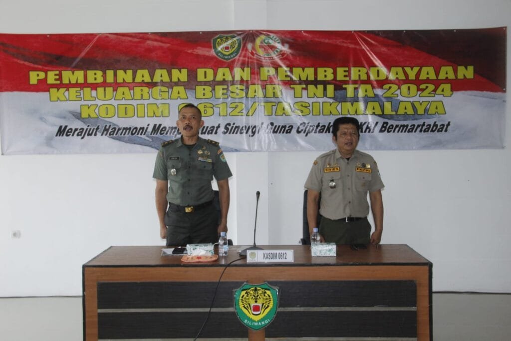 Tasikmalaya, Kamis, 7 November 2024 – Kodim 0612/Tasikmalaya mengadakan kegiatan pembinaan dan pemberdayaan bagi Keluarga Besar TNI dengan tema “Sumber Daya Manusia, Keluarga Besar TNI, Unggul, NKRI Kuat”. Bertempat di Aula Makodim 0612/Tasikmalaya, acara ini bertujuan memperkuat kapasitas dan kualitas Keluarga Besar TNI sebagai salah satu komponen pendukung pertahanan negara sekaligus pembangunan bangsa.