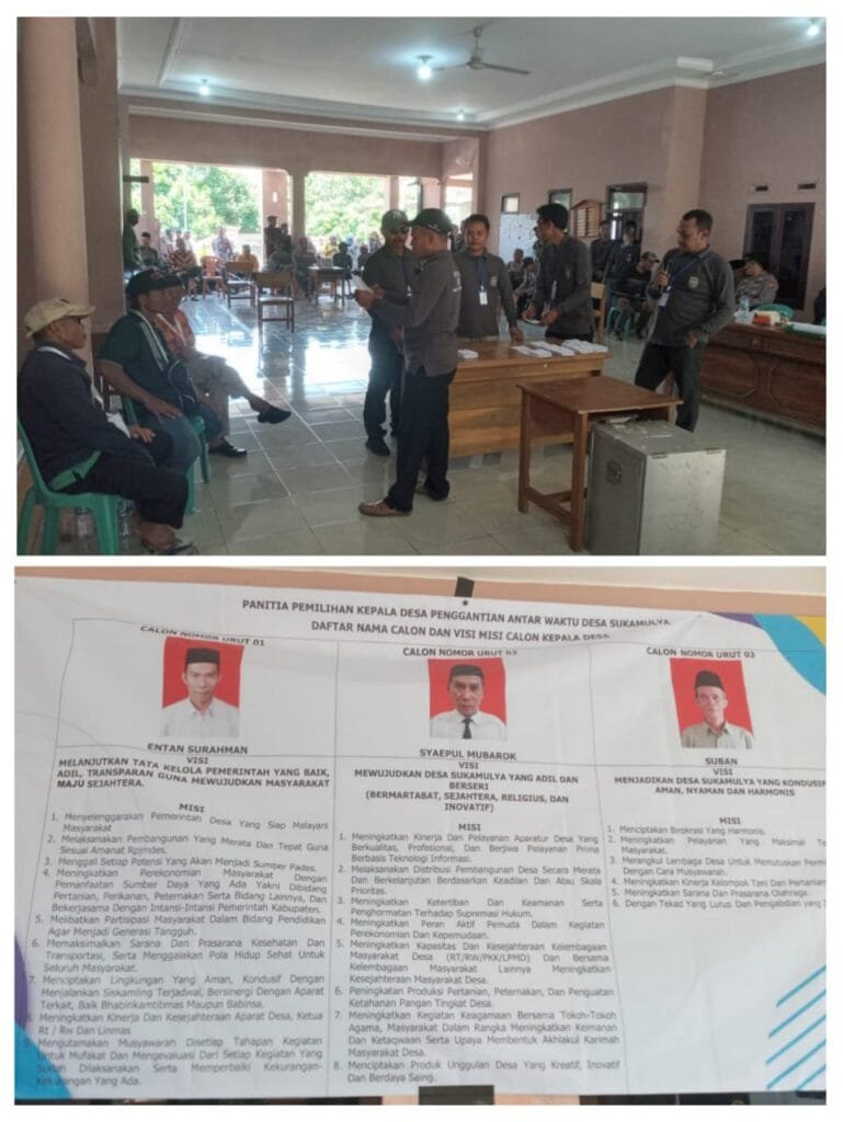 Ada tiga calon kandidat yang memperebutkan kedudukan sebagai Kepala Desa PAW Desa Sukamulya,dari tiga calon itu di antara nya nomor urut