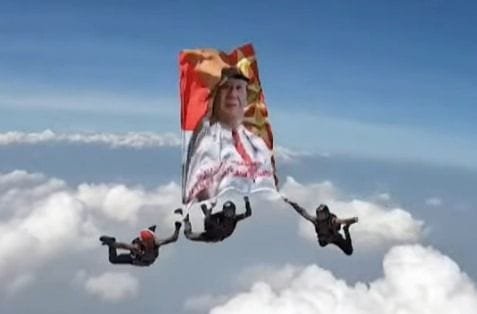 Foto kedua pemimpin itu kemudian berkibar di langit sambil dibawa oleh para penerjun payung. Selain itu, para penerjun payung juga membawa bendera satuan Polri.