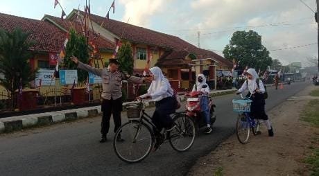 Tampak terlihat anggota Polsek Lakbok Polres Ciamis Polda Jabar memberikan pelayanan masyarakat di pagi hari dengan memberikan pelayanan dengan pengaturan lalu lintas dan membantu warga menyebrang.