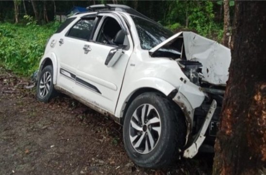“Mobil yang melaju di dalam trek yang lurus, mobil yang dikendarai oleh sang istri kades Lia Patmawati (30) oleng ke arah kiri, lalu menabrak pohon besar hingga bagian depannya ringsek.