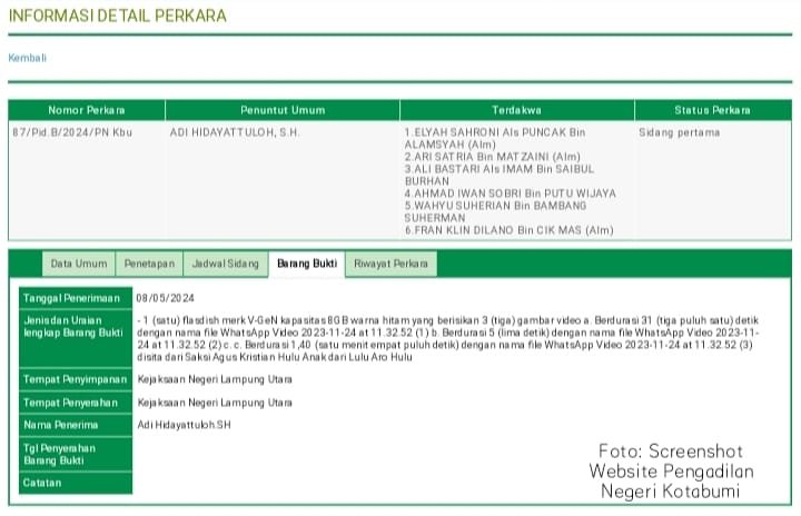 Dengan nomor perkara 87/Pid.B/2024/PN.Ktb. yang di lihat dari website resmi Pengadilan Negeri Kotabumi perkara itu akan mulai di adili pada 15 Mei Rabu 2024 besok.