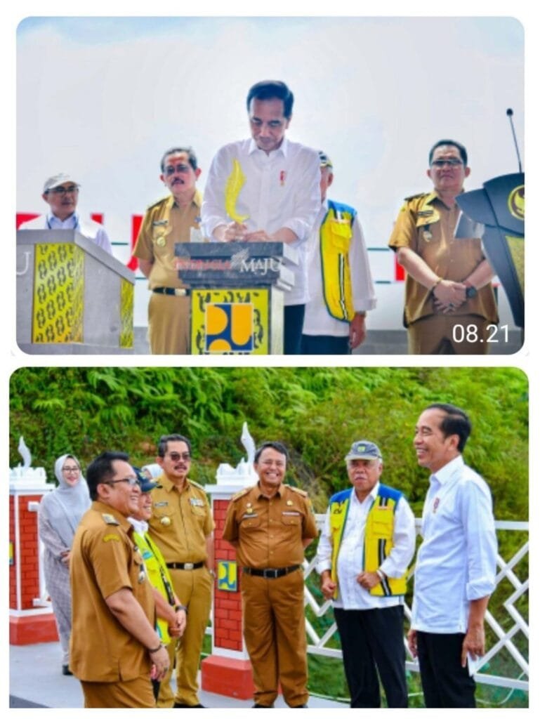 Presiden Jokowi tiba di lokasi bendungan sekitar pukul 11.15 WIB, disertai oleh Ibu Negara Iriana dan Menteri Pekerjaan Umum dan Perumahan Rakyat (PUPR) Basuki Hadimuljono.
