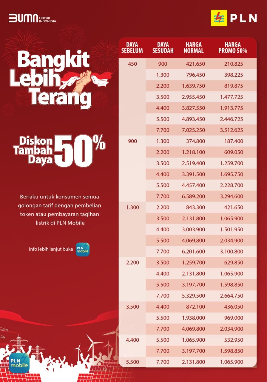 Melalui program bertajuk “Bangkit Lebih Terang”, pelanggan PLN dapat menikmati promo tambah daya ini yaitu pelanggan mulai dari daya 450 VA hingga 5.500 VA. Diskon yang diberikan mencapai hingga 50% dari biaya normal tergantung pada daya yang dipilih. Program ini berlaku mulai tanggal 10 hingga 23 Mei 2025, dan dapat diakses melalui aplikasi PLN Mobile. Promo ini juga ditujukan bagi konsumen semua golongan tarif dengan melakukan pembelian token atau pembayaran tagihan listrik di PLN Mobile. Proses pendaftaran dilakukan secara digital melalui aplikasi PLN Mobile guna memudahkan dan mempercepat pelayanan.