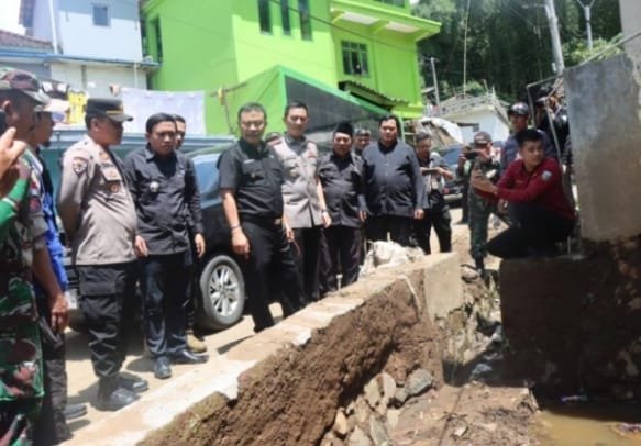 GARUT, Jejak-kriminal -Menindaklanjuti kejadian bencana alam meluapnya air dan lumpur ke Jalan Desa di Kampung Cibojong Desa Balewangi Kecamatan Cisurupan Kabupaten Garut yang terjadi pada hari Rabu lalu, Kapolres Garut Polda Jabar AKBP Rohman Yonky Dilatha, S.I.K., M.Si., beserta Forkopimda Kabupaten Garut tinjau lokasi bencana. Jumat (23/02/2024).