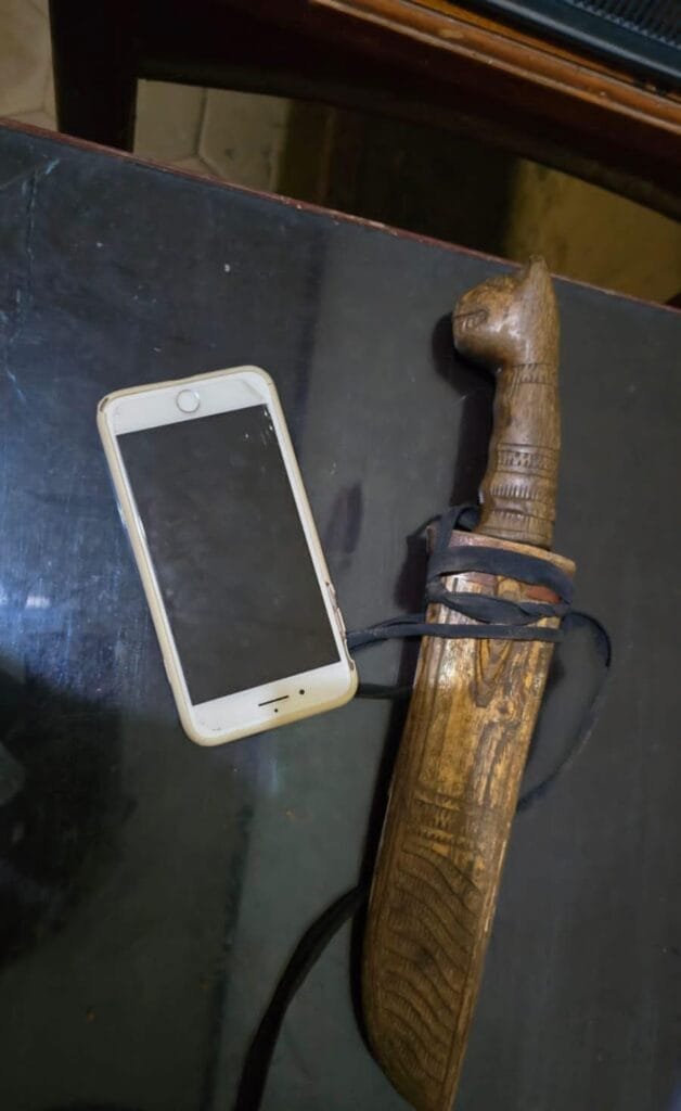 Pelaku kini telah di amankan untuk pemeriksaan lebih lanjut. Barang bukti yang berhasil di amankan HP iPhone milik korban dan satu buah golok.