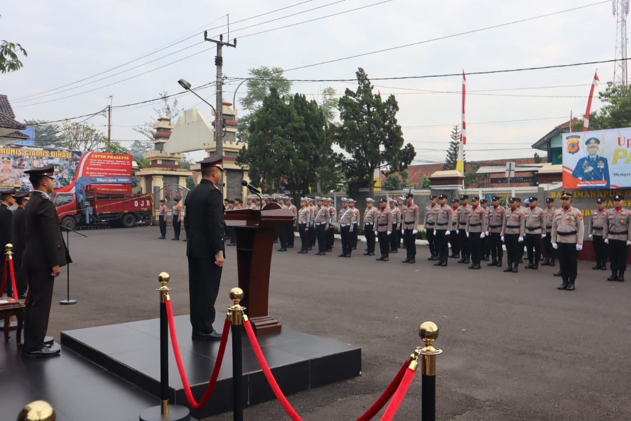 Upacara tersebut dipimpin langsung oleh Wakapolres Ciamis, Kompol Sujana, S.Pd., yang bertindak sebagai Inspektur Upacara (Irup), serta diikuti oleh para Pejabat Utama (PJU) dan seluruh personel Polres Ciamis sebagai peserta upacara.