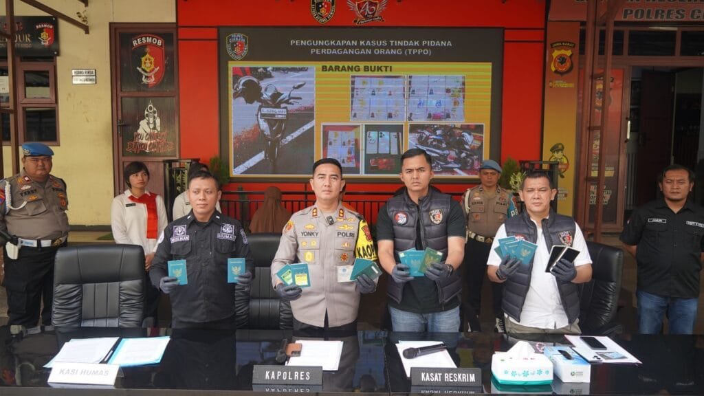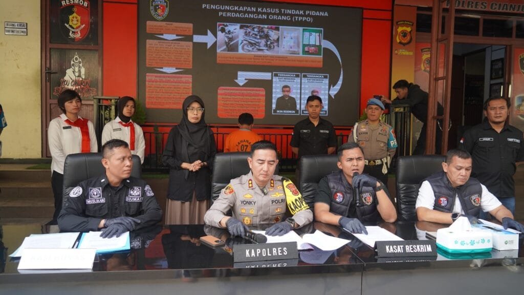 Cianjur – Jejak-kriminal.com- Polres Cianjur menggelar koferensi pers pengungkapan kasus tindak pidana perdagangan orang (TPPO) yang terjadi di Kabupaten Cianjur, konferensi pers tersebut dipimpin langsung Kapolres Cianjur AKBP Rohman Yonky Dilatha, S.I.K., M.Si., M.H dan berlangsung di Mapolres Cianjur, Jumat (01/11/2024).