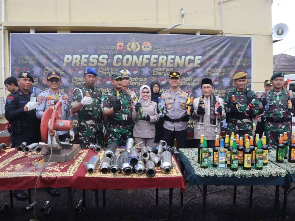 Cianjur – Jejak-kriminal.com-Polres Cianjur bersama jajaran Forkopimda Kabupaten Cianjur memusnahkan knalpot brong dan minuman keras hasil razia, pemusnahan tersebut berlangsung di Mapolres Cianjur setelah pelaksanaan Apel Gelar Pasukan Ops Lilin Lodaya, Jumat (20/12/2024).