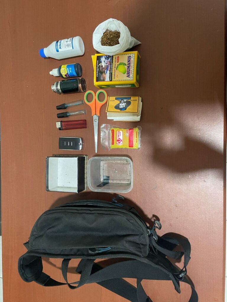 Kasat Narkoba AKP Usep Sudirman, S.H., menjelaskan bahwa dari hasil penggeledahan di lokasi penangkapan dan rumah pelaku, petugas menemukan total 8 paket tembakau sintetis, bahan campuran berupa cairan narkotika, tembakau bermerek “Arumanis”, pewarna makanan, alkohol, timbangan digital, plastik klip, dan peralatan lainnya.