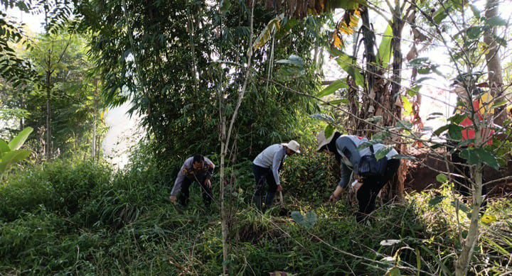 Personel Polsek Bayongbong tampak bergotong royong bersama pengurus BUMDes, Babinsa, serta warga sekitar dalam pengolahan awal lahan.