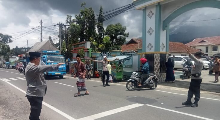Selain itu, anggota Polsek Bayongbong juga melakukan pengaturan lalu lintas dan membantu masyarakat dalam penyebrangan jalan, terutama di sekitar area mesjid yang sering ramai pengunjung.