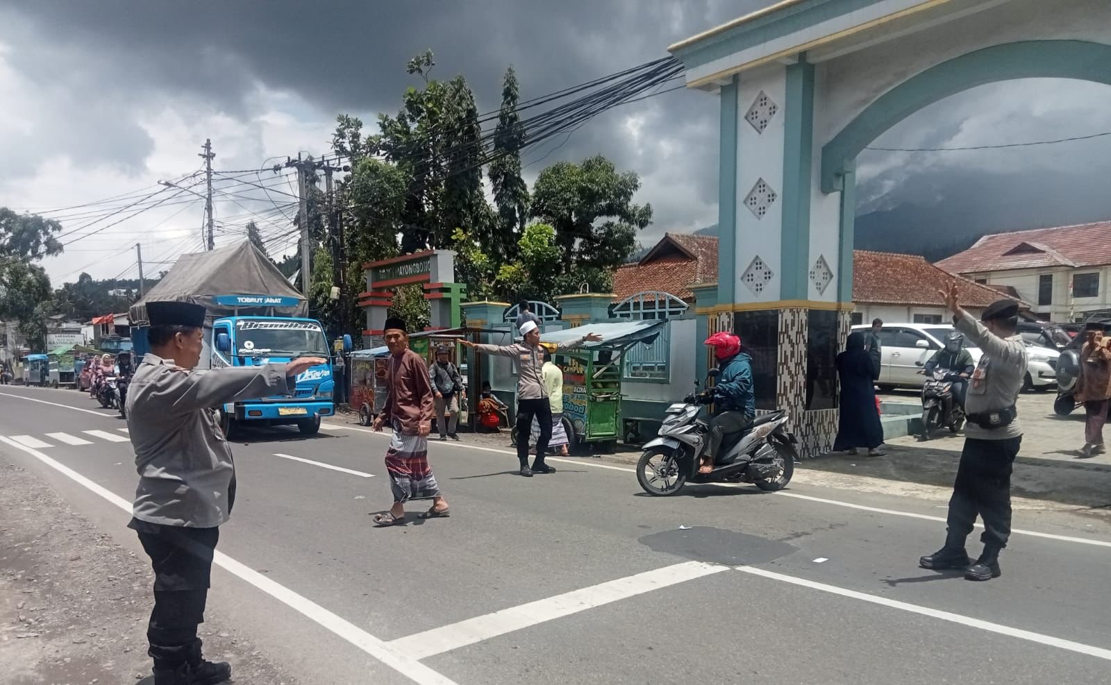 Selain itu, anggota Polsek Bayongbong juga melakukan pengaturan lalu lintas dan membantu masyarakat dalam penyebrangan jalan, terutama di sekitar area mesjid yang sering ramai pengunjung.
