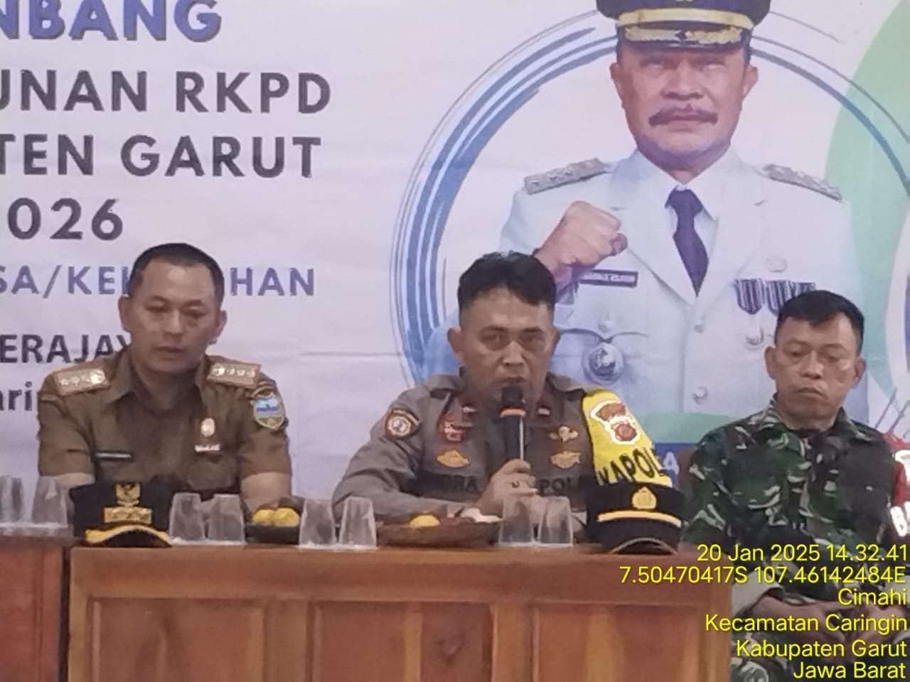 Polres Garut AKBP Mochamad Fajar Gemilang.,S.I.K.,M.H.M.I.K. Melalui Kapolsek Caringin IPDA Indra Koncara. Didampingi Anggota. Saya berharap juga, program pembangunan di tahun 2025 juga berjalan lancar dan baik. Dan hari ini kita melaksanakan Musrenbang untuk penyusunan RKPD Kabupaten Garut tahun 2026. Harapannya, pemerataan pembangunan di 2026 bisa terealisasi,” ujar Indra.