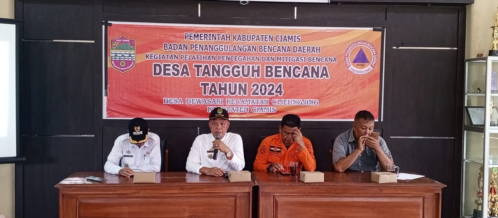 CIAMIS ~ Personel Polsek Cijeungjing Polres Ciamis Polda Jabar menghadiri acara Kesiapsiagaan Tanggap Bencana Skala Lokal Desa (Mitigasi Bencana) tingkat desa. Acara pembukaan tersebut digelar di aula Kantor Desa Dewasari, Kecamatan Cijeungjing, Kabupaten Ciamis, Jawa Barat, Rabu (23/10/2024).