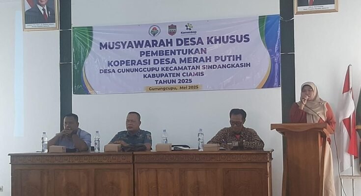 CIAMIS ~ Polsek Cikoneng Polres Ciamis Polda Jabar mengikuti kegiatan musyawarah desa khusus pembentukan Koperasi Merah Putih Desa Gunungcupu. Kegiatan itu bertempat di Aula Kantor Desa Gunungcupu, Kecamatan Sindangkasih, Kabupaten Ciamis, Jawa Barat, Sabtu (17/5/2025).