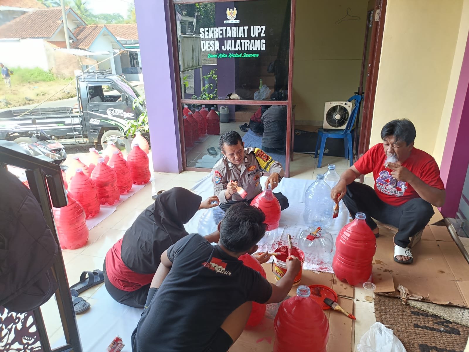 Dalam kegiatan tersebut, Bhabinkamtibmas Desa Jalatrang Aiptu Agus Hendra bersama Kepala Desa dan perangkat desa melaksanakan pengecatan galon air mineral serta penataan pekarangan kantor desa sebagai bagian dari penilaian lomba P2B yang digelar oleh Mabes Polri dalam rangka menyambut Hari Bhayangkara ke-79 tahun 2025.