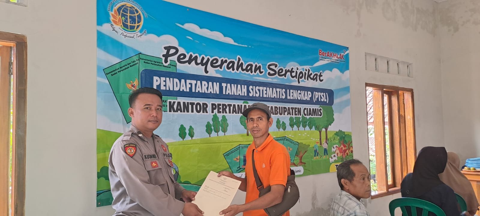CIAMIS ~ Polsek Cisaga Polres Ciamis Polda Jabar menghadiri kegiatan Penyerahan Sertifikat PTSL ke masyarakat Desa Tanjungjaya. Kagiatan itu bertempat di yang bertempat di Aula Kantor Desa Tanjungjaya, Kecamatan Cisaga, Kabupaten Ciamis, Jawa Barat, Selasa (27/5/2025).