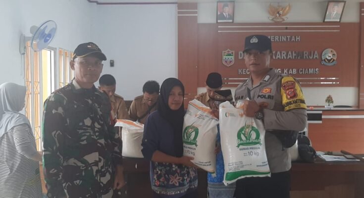 CIAMIS ~ Personel Polsek Kawali Polres Ciamis Polda Jabar melaksanakan pengamanan kegiatan penyaluran bantuan beras cadangan dari Pemerintah di Desa Sukaraharja. Pengamanan ini dilaksanakan di Aula Desa Sukaraharja, Kecamatan Lumbung, Kabupaten Ciamis, Jawa Barat, Senin (28/7/2025).