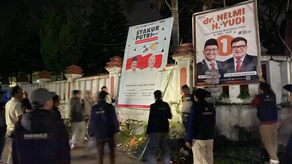 Garut | Polsek Malangbong bersama unsur Forkopimca, PPK dan Panwaslu melaksanakan pendampingan dalam kegiatan penertiban alat peraga kampanye (APK) di wilayah Kecamatan Malangbong. Minggu (24/11/2024).