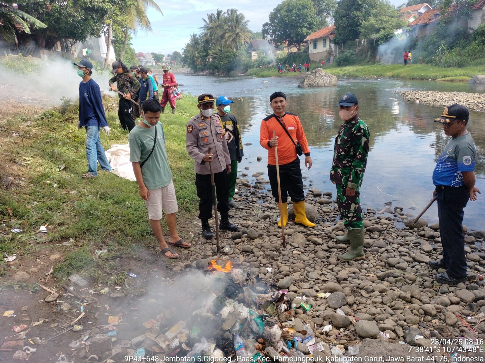 Dalam upaya menjaga kebersihan lingkungan dan mengantisipasi potensi banjir saat musim hujan, Polsek Pameungpeuk bersama unsur Forkopimcam dan ratusan relawan melaksanakan kegiatan kerja bakti membersihkan bantaran Sungai Cikaso–Cipaleubuh yang berlokasi di wilayah Kecamatan Pameungpeuk, Kabupaten Garut. Rabu (23/04/2025).
